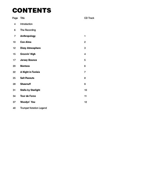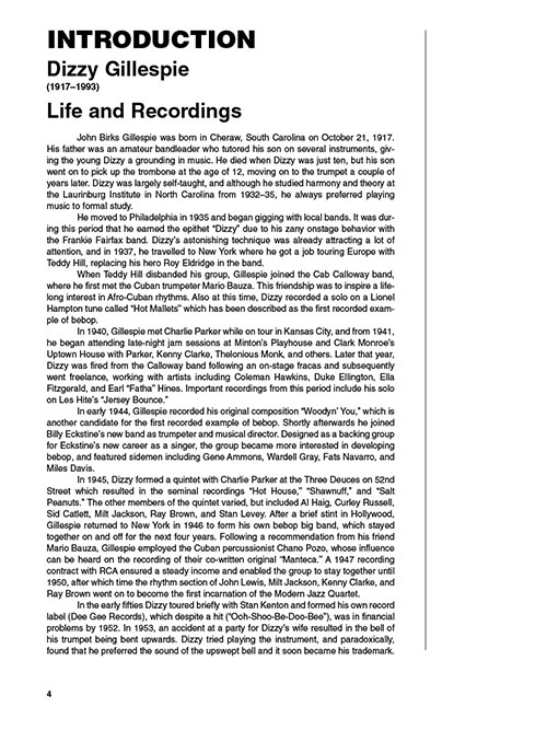 Aprenda, passo a passo, a música de Dizzy Gillespie, incluindo: Anthropology • Con Alma • Dizzy Atmosphere • Groovin' High • Jersey Bounce • Manteca • A Night in Tunisia • Salt Peanuts • Shawnuff • Stella by Starlight • Tour De Force • Woodyn' You.