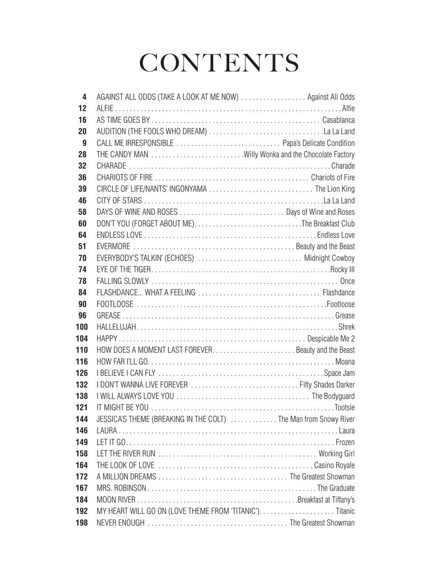 Este clássico Songbook está em sua quinta edição, e apresenta 75 das mais famosas músicas da história do cinema. Inclui: Against All Odds • Circle of Life • I Am a Man of Constant Sorrow • Moon River • My Heart Will Go On • Over the Rainbow • Raindrops Keep Fallin' on My Head • Singin' in the Rain • Stayin' Alive • Summer Nights • Take My Breath Away • Unchained Melody • When You Wish upon a Star • and more.