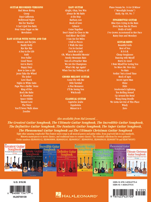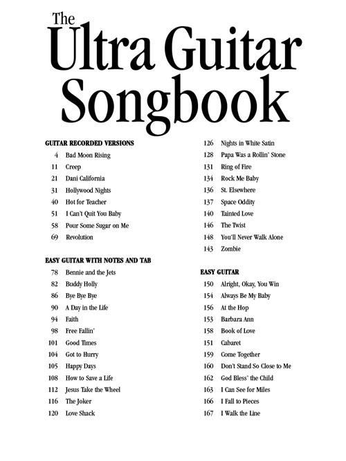 Transcrições para guitarra na partitura e tablatura, incluindo: Bad Moon Rising • Dani California • Hot for Teacher • I Can See for Miles • I Can't Quit You; Easy Guitar: Bennie and the Jets • Free Fallin' • How to Save a Life • Love Shack • Luck Be a Lady • Ring of Fire • Tainted Love • You'll Never Walk Alone; Chord Melody Guitar: Come Fly with Me • Feliz Navidad • Witchcraft; Classical Guitar: Capricho Arabe • Minuet in G; Fingerstyle Guitar: Every Rose Has Its Thorn • Fields of Gold; Guitar Riffs: Beautiful Girls • Cheap Sunglasses • Dancing with Myself • We Gotta Get Out of This Place • e outras!!!