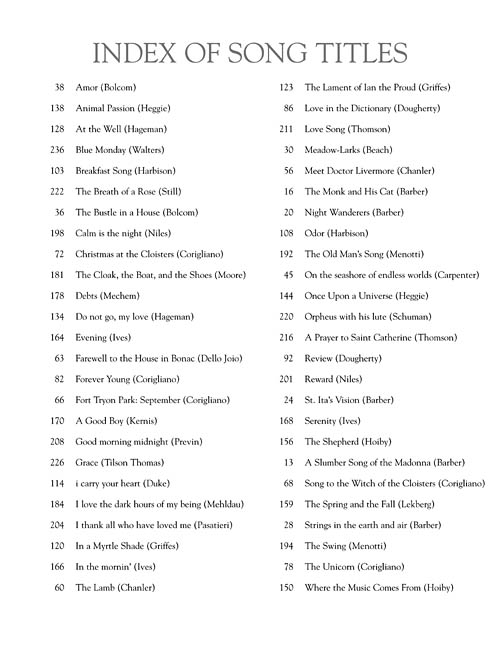 This comprehensive collection is the best one-volume source available on the topic, with a mix of familiar recital standards and intriguing material awaiting discovery. Includes composers from c. 1900 into the 21st century. Some songs make their first published appearance in American Art Song: Gian Carlo Menotti's moving "The Old Man's Song," Michael Tilson Thomas' inspired "Grace," dedicated to Leonard Bernstein, and Aaron Jay Kernis' "A Good Boy," as well a boogie-woogie art song by the editor, "Blue Monday." The same songs appear in High Voice and Medium/Low Voice.