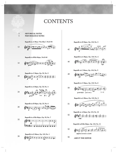 Beethoven compôs 24 bagatelas durante sua vida. Esta coleção inclui 14 peças, incluindo o famoso "Für Elise", que são apropriadas para pianistas intermediários a avançados.