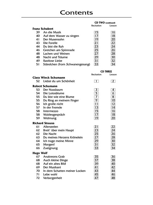 This is a companion to The Lieder Anthology, edited by Virginia Saya and Richard Walters, with 65 songs by 13 composers. The diction lessons were recorded by Irene Spiegelman, German coach at the Metropolitan Opera. The diction for each song is recorded twice: first recited as an actor would speak it, showing flow of the language and the mood, followed by a slow, deliberate lesson, allowing time for the student to repeat each line. This experienced language coach adapts the "R" in German in the slow versions as recommended for classical singers. She is also very sensitive to liaisons between word sounds in the musical settings.