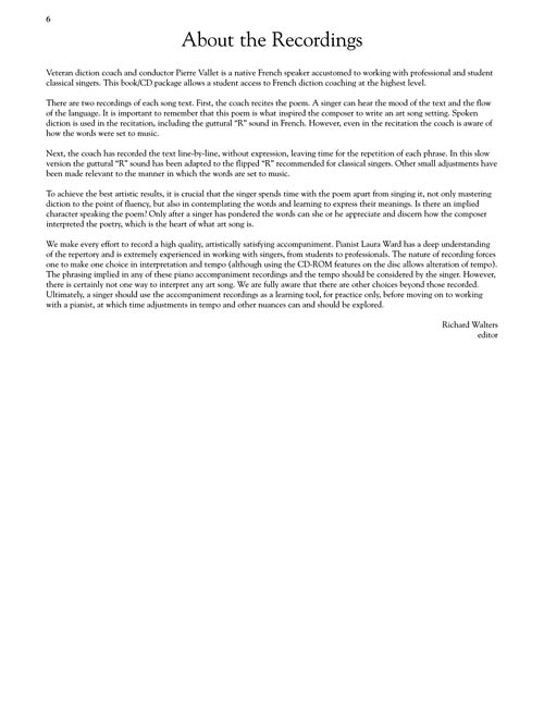 This is a collection of the most famous songs of Fauré. Diction lessons were recorded by coach, conductor and diction specialist Pierre Vallet. The diction for each song is recorded twice: first recited as an actor would speak it, showing flow of the language and mood, followed by a slow, deliberate lesson, allowing time for the student to repeat each line. This experienced language coach adapts the "R" in French in the slow versions as recommended for classical singers. He is also very senstive to liaisons between word sounds in musical settings.