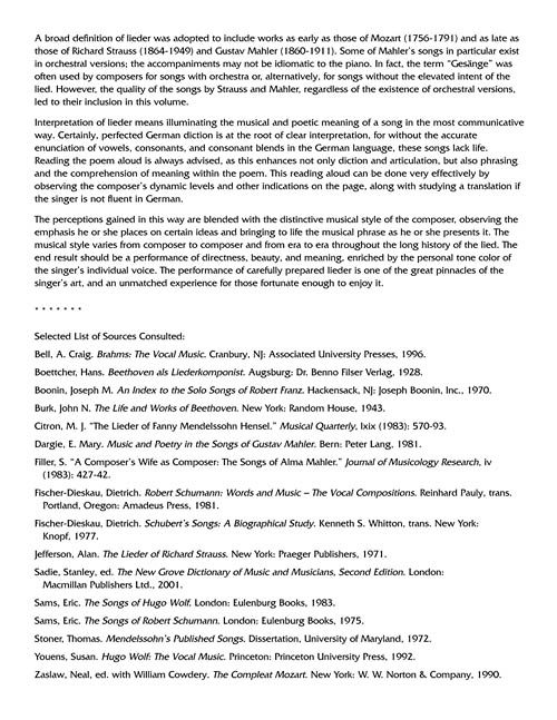 This edition presents 65 diverse songs by major composers of German art song, or lieder, and is the perfect one-volume lieder source for voice students. All the songs are new Vocal Library editions. Historical notes about the relevant history and background of each song are included, as are line-by-line translations for study. A select committee of experienced voice teachers was consulted to choose the most essential and vocally instructive songs in compiling this collection. Composers represented: Beethoven, Brahms, Franz, Gustav Mahler, Alma Mahler, Fanny Hensel, Mendelssohn, Mozart, Schubert, Clara Schumann, Robert Schumann, Strauss, Wolf. This collection includes the first American edition of Funf Ophelia Lieder by Brahms.