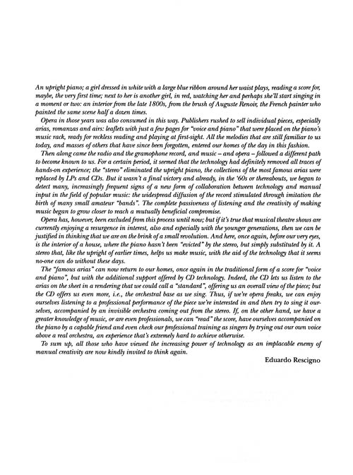 Cantolopera is an exceptional new series of book/CD packs from Ricordi that offers a fresh approach to great opera repertoire. The books include versions for voice and piano of the world's most famous arias. The CDs feature two versions of each aria: one with a 130-piece orchestra providing accompaniments to allow the professional, student or opera fan to practice, and another sung by an established artist for reference.