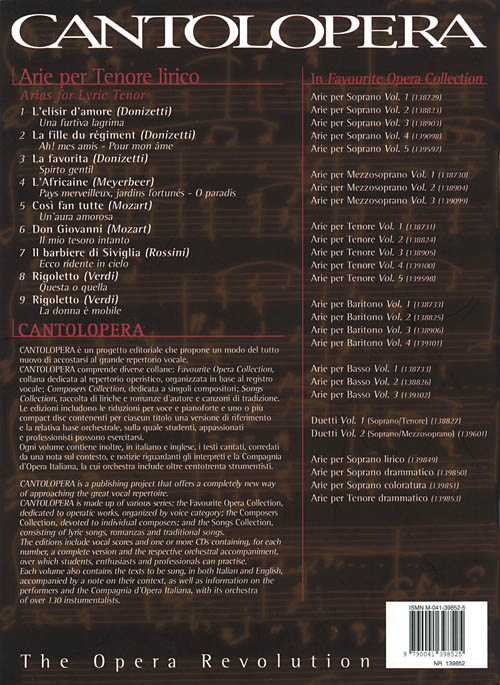 Cantolopera is an exceptional new series of book/CD packs from Ricordi that offers a fresh approach to great opera repertoire. The books include versions for voice and piano of the world's most famous arias. The CDs feature two versions of each aria: one with a 130-piece orchestra providing accompaniments to allow the professional, student or opera fan to practice, and another sung by an established artist for reference.