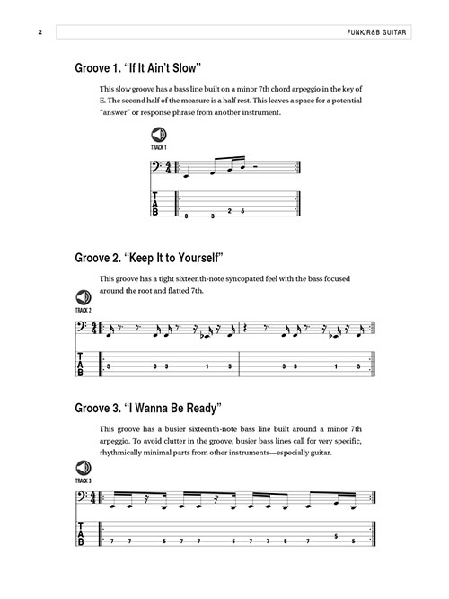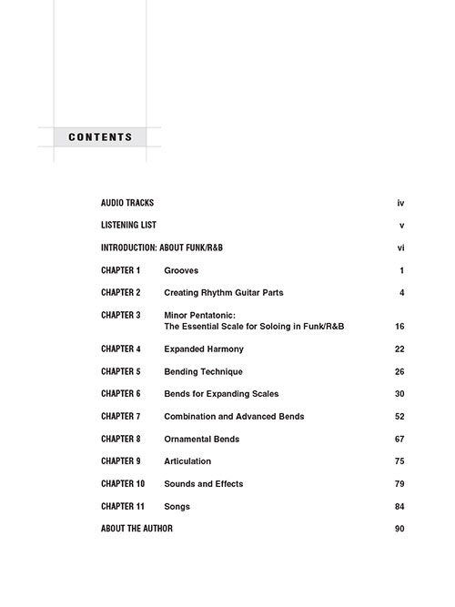 Estes exercícios práticos, licks e discussões técnicas irão ajudá-lo a tocar no estilo de Kool and the Gang, Prince, James Brown, Sly and the Family Stone, Jimi Hendrix, Curtis Mayfield, Soulive e outros grandes artistas, desde Old School até Funk contemporâneo / R & B grooves. O áudio apresenta trilhas de demonstração e prática, tocadas pelo grupo de R & B / Funk, de Boston, Thaddeus Hogarth Band. Partituras, tablatura e diagramas estão incluídos. Você aprenderá construir solos; entender e usar escalas sobre harmonias funk / R & B; criar partes de guitarra rítmica que suportem grooves de funk / R & B; bend para expandir sua paleta de escalas, harmonias e ornamentação; e muito mais!