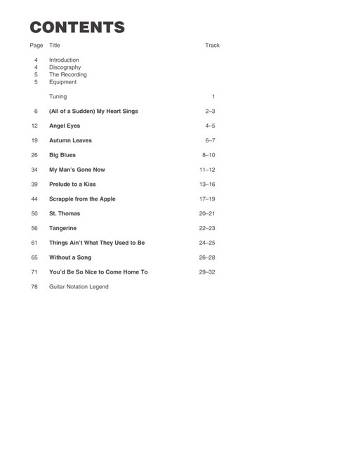 Discover the quiet elegance of one of jazz guitar's most renowned players with this Signature Licks book/online audio pack. Each song chapter contains in-depth analysis and audio with slow demos. Songs covered include: Angel Eyes • Autumn Leaves • Prelude to a Kiss • St. Thomas • Scrapple from the Apple • Tangerine • You'd Be So Nice to Come Home To • and more.