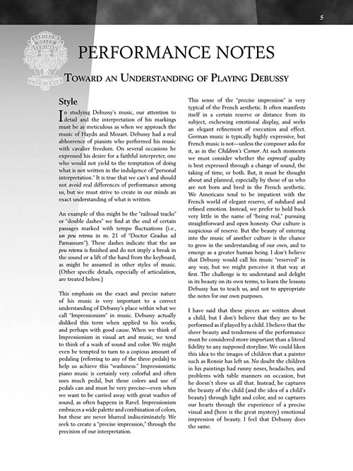 Claude Debussy dedicated "Children's Corner" to his daughter, Chou-Chou, when she was three years old. Some of the movements were inspired by her toys. The six lovely pieces expertly presented here by Christopher Harding are an excellent starting point for introducing late-intermediate to early-advanced piano students to impressionism. Includes a special appendix with suggested pedaling, plus a glossary of French terms.
