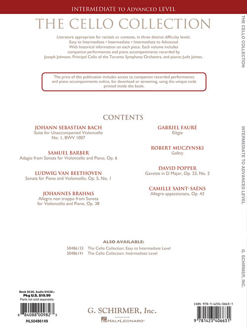 Transcrições para Cello para músicos de nível intermediário/avançado. Audio Online disponível com as performances. Suite for Unaccompanied Violoncello No. 1, BWV 1007 (J.S. Bach) • Adagio from Sonata for Violoncello and Piano, Op. 6 (Barber) • Sonata for Piano and Violoncello, Op. 5, No. 1 (Beethoven) • Allegro non troppo from Sonata for Violoncello and Piano, Op. 38 (Brahms) • Elégie (Fauré) • Gallery (Muczynski) • Gavotte in D Major, Op.23, No. 2 (Popper) • Allegro appassionato, Op. 43 (Saint-Saëns).