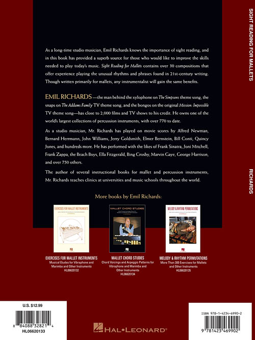 As a long-time studio musician, Emil Richards knows the importance of sight reading, and in this book has provided a superb source for those who would like to improve the skills needed to play today's music. Sight Reading for Mallets contains over 30 compositions that offer experience playing the unusual rhythms and phrases found in 21st-century writing. Though written primarily for mallets, any instrumentalist will gain the same benefits.