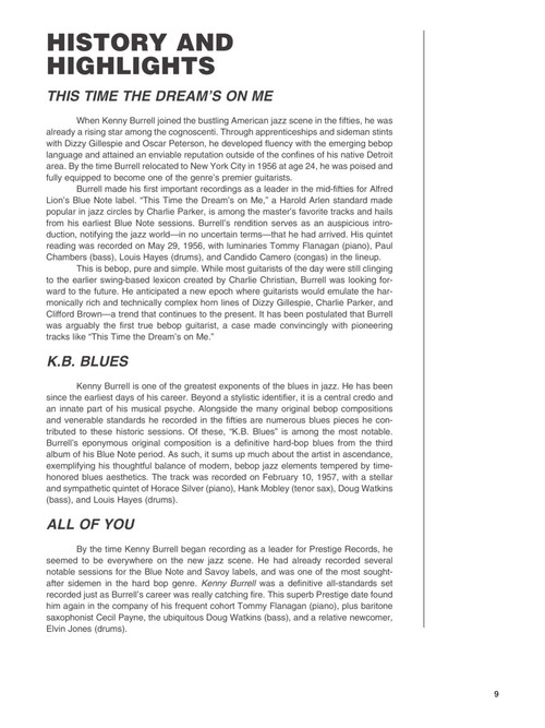 Wolf Marshall analisa temas gravados por Kenny Burrell e destrincha toda a técnica de um dos maiores guitarristas de jazz da história, incluindo: Autumn Leaves • Groovin' High • In a Sentimental Mood • Lyresto • Moment's Notice • My Favorite Things • This Time the Dream's on Me • Wholly Cats • e outras.