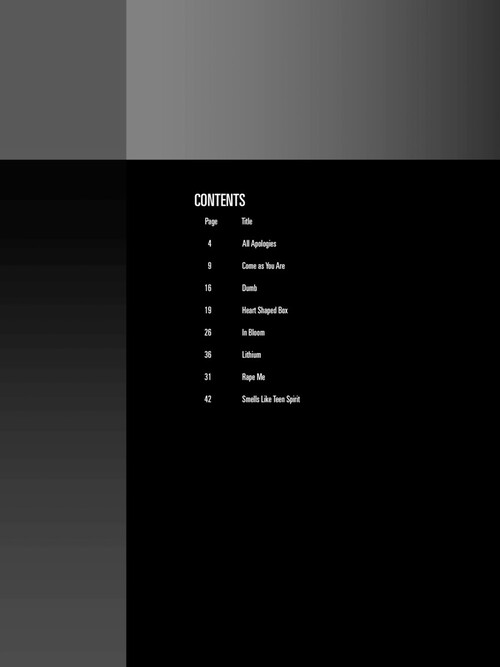 A série Bass Play-Along Series vai ajudá-lo a tocar as suas canções favoritas de forma rápida e fácil. Basta seguir a partitura ou a tablatura, ouvir o audio para sentir como soa o som do Baixo e depois tocar junto utilizando a faixa de play-back. A melodia e a letra também estão escritas caso você queira cantar. Incluindo: All Apologies • Come as You Are • Dumb • Heart Shaped Box • In Bloom • Lithium • Rape Me • Smells like Teen Spirit.