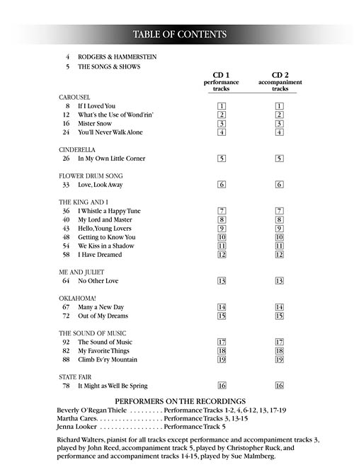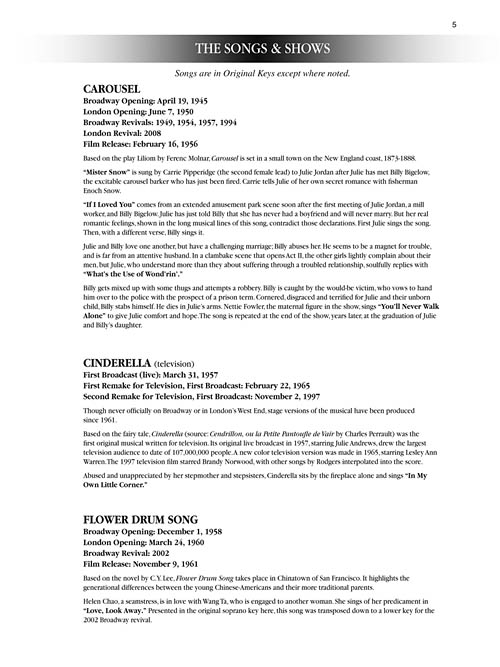The ultimate R&H source for singers, with a unique song list for each voice type. Each volume includes an introduction about each show and plot notes for each song, plus a Rodgers & Hammerstein biography. The series represents 10 musicals: Oklahoma!, Carousel, State Fair, Allegro, South Pacific, The King and I, Me and Juliet, Cinderella, Flower Drum Song and The Sound of Music. These packages include audio tracks featuring full performances and piano accompaniments. The audio is accessed online using the unique code inside each book and can be streamed or downloaded. The audio files include PLAYBACK+, a multi-functional audio player that allows you to slow down audio without changing pitch, set loop points, change keys, and pan left or right.