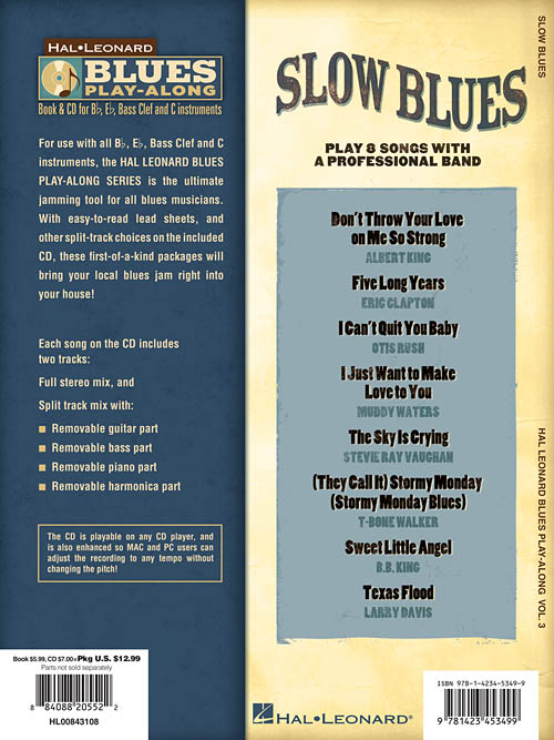 For use with all C, Bb, Eb, and Bass Clef instruments, the Hal Leonard Blues Play-Along Series is the ultimate jamming tool for all blues musicians. With easy-to-read lead sheets, and other split-track choices on the inlcuded CD, these first-of-a-kind packages will bring your local blues jam right into your house! Each song on the CD includes two tracks: a full stereo mix, and a split track mix with removable guitar, bass, piano, and harmonica parts.