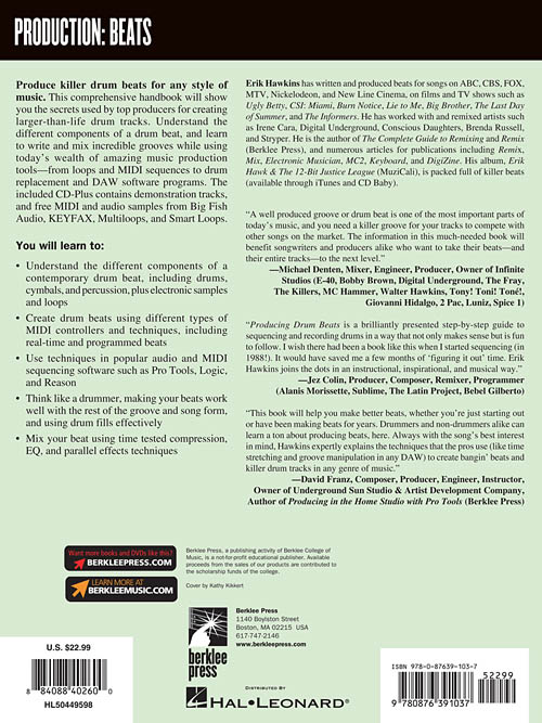 "This book will help you make better beats, whether you're just starting out or have been making beats for years. Drummers and non-drummers alike can learn a ton about producing beats, here. Always with the song's best interest in mind, Hawkins expertly explains the techniques that the pros use (like time stretching and groove manipulation in any DAW) to create bangin' beats and killer drum tracks in any genre of music."