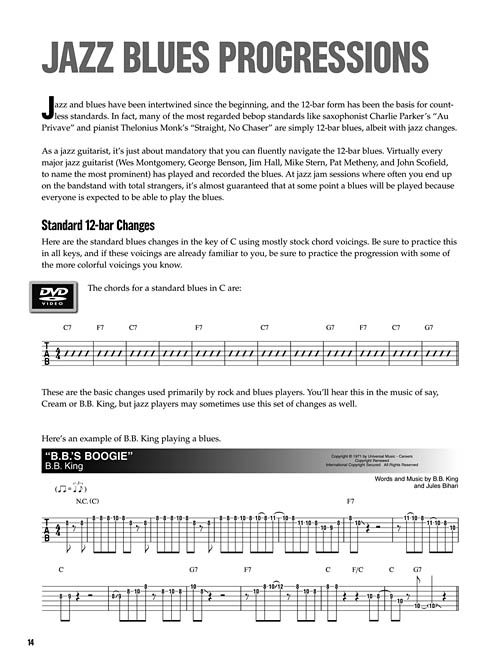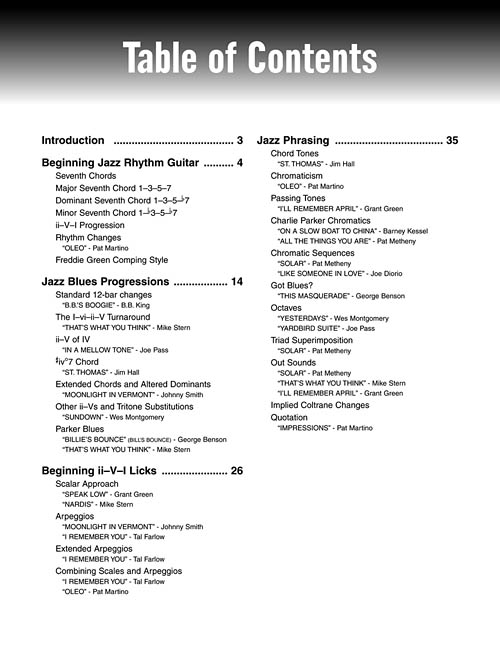 A coleção "At A Glance" mostra toda a capacidade da editora Hal Leonard no ensino da música e na interatividade com o músico. Os livros são bem práticos e vão direto ao assunto proposto, utilizando trechos de músicas como exemplo, tornando o estudo muito eficente e empolgante. As tablaturas estão disponíveis no livro e no DVD, onde você pode visualizar em 2 velocidades, possui dicas da técnica e execução, e ainda pode conferir conteúdos adicionais. Para este volume os temas estudados são: Guitarra rítmica no jazz, progressões jazz-blues, licks em II-V-I e fraseado. O autor utiliza trechos de 20 músicas para demonstração, entre elas: B.B.'s Boogie • Billie's Bounce (Bill's Bounce) • I'll Remember April • Moonlight in Vermont • St. Thomas • Speak Low • This Masquerade • Yardbird Suite • Entre Outras.