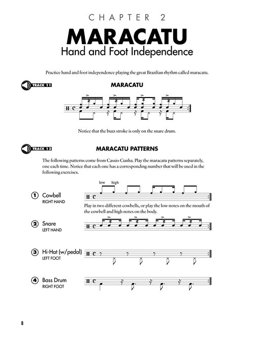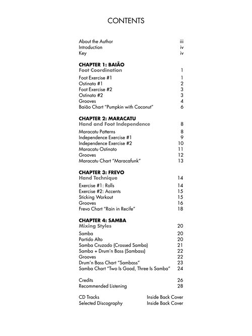 This drum guide teaches exercises and grooves based on such Brazilian rhythms as baião, samba, maracatu and frevo. Its purpose is not only to present these traditional rhythms, but also to provide tools to stimulate creativity on the drums. The CD contains 40+ tracks - all of the examples in the book, five complete tunes, and play-along tracks. This practical guide of ideas and grooves will surely enrich your musical vocabulary.
