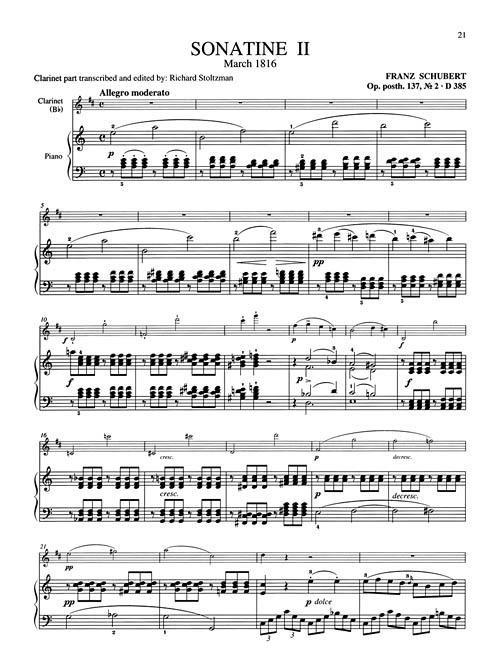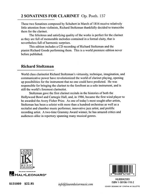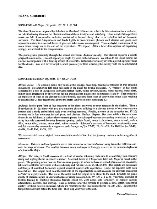 These two Sonatines composed by Schubert in March of 1816 receive relatively little attention from violinists, Richard Stoltzman thankfully decided to transcribe them for the clarinet. The felicitous and satisfying quality of the works is perfect for the clarinet as they are full of memorable melodies contained in a formal claity, that is nevertheless full of harmonic surprises. This edition includes a CD recording of Richard Stoltzman and the pianist Richard Goode performing them. This is a world premiere edition never before published.