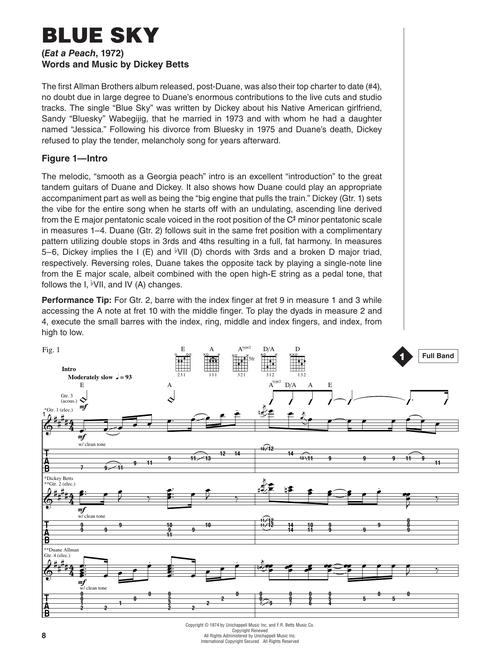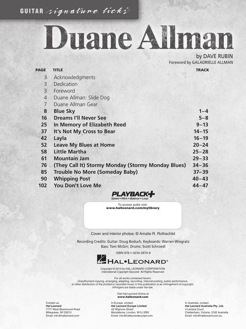 Aprenda as músicas e os solos de Duane Allman; incluindo: Blue Sky • Dreams I'll Never See • In Memory of Elizabeth Reed • It's Not My Cross to Bear • Layla • Leave My Blues at Home • Little Martha • Mountain Jam • (They Call It) Stormy Monday (Stormy Monday Blues) • Trouble No More (Someday Baby) • Whipping Post • You Don't Love Me.