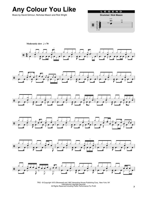 Você vai poder tocar as suas canções preferidas com a série Drum Play-Along. Basta seguir a partitura e ouvir o áudio para sentir como soa o som da bateria e depois tocar junto utilizando a faixa de play back. As letras estão incluídas para referência. Incluindo: Any Colour You Like • Brain Damage • Breathe • Eclipse • Money • Time • Us and Them.