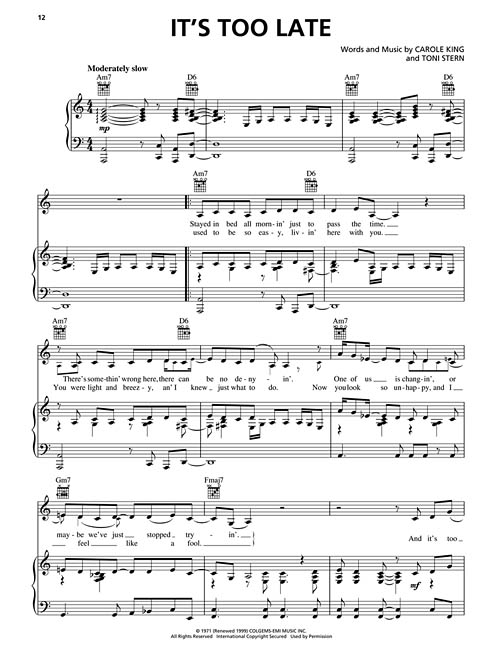 Com este livro, pianistas e tecladistas poderão praticar e tocar com acompanhamento de nível profissional. Transcrições para piano/teclado, com as letras e cifras para guitarra e violão. O CD traz duas faixas para cada música: uma com a versão completa com a melodia e outra sem a melodia para que você possa tocar junto; incluindo: Hi-De-Ho (That Old Sweet Roll) • I Feel the Earth Move • It's Too Late • Jazzman • So Far Away • Sweet Seasons • Will You Love Me Tomorrow (Will You Still Love Me Tomorrow) • You've Got a Friend.