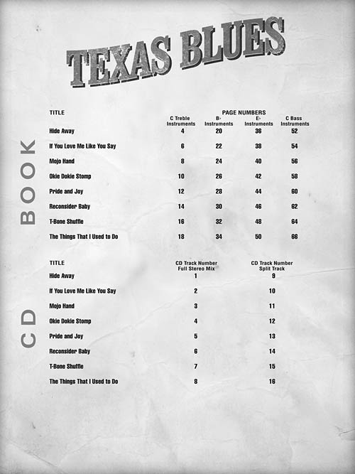 Esta série traz todos os temas transcritos para instrumentos em C, Eb, Bb e Clave de Fá. No CD cada tema tem duas gravações; uma faixa completa com a melodia e uma segunda faixa com o mesmo tema, porém sem a melodia, somente o play-back para que você possa tocar junto. O CD ainda pode ser usado em PC ou Mac com possibilidade de alterar o tempo sem alterar o tom. As gravações são de excelente qualidade, mostrando a real atmosfera blues, incluindo gaitas, guitarras e muitos elementos nos arranjos. Incluindo: Hide Away • If You Love Me like You Say • Mojo Hand • Okie Dokie Stomp • Pride and Joy • Reconsider Baby • T-Bone Shuffle • The Things That I Used to Do.