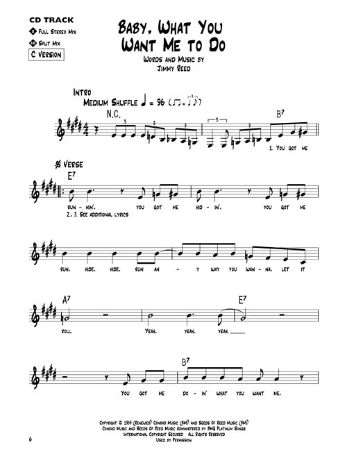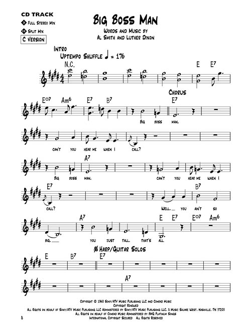 Esta série traz todos os temas transcritos para instrumentos em C, Eb, Bb e Clave de Fá. No CD cada tema tem duas gravações; uma faixa completa com a melodia e uma segunda faixa com o mesmo tema, porém sem a melodia, somente o play-back para que você possa tocar junto. O CD ainda pode ser usado em PC ou Mac com possibilidade de alterar o tempo sem alterar o tom. As gravações são de excelente qualidade, mostrando a real atmosfera blues, incluindo gaitas, guitarras e muitos elementos nos arranjos. Incluindo: Ain't That Lovin' You Baby • Baby, What You Want Me to Do • Big Boss Man • Bright Lights, Big City • Going to New York • Honest I Do • You Don't Have to Go • You Got Me Dizzy.