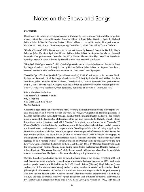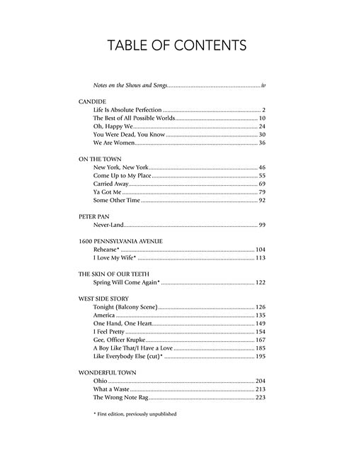 First-time collection of Bernstein's theatre songs, with selections from Candide, Mass, On the Town, Peter Pan, 1600 Pennsylvania Avenue, West Side Story, Wonderful Town, and other shows. Includes songs cut from shows and other songs never before published. With extensive commentary.