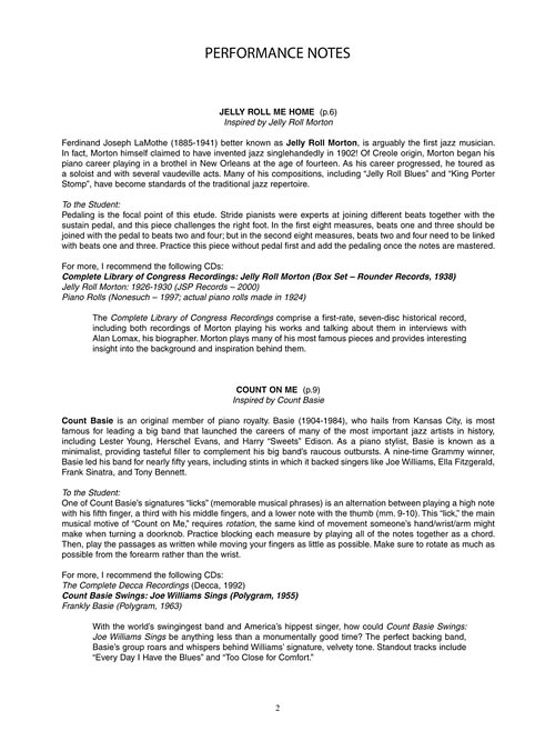 Jazz Etude Inspirations is a collection of eight original piano etudes inspired by some of the most important jazz pianists in history. Etudes in the style of legendary greats Oscar Peterson, Duke Ellington, McCoy Tyner, Jelly Roll Morton, Chick Corea, Brad Mehldau, Count Basie and Herbie Hancock will help students master some technical challenges posed by each artist's individual style. The performance notes include a biography, practice tips and a list of significant recordings.