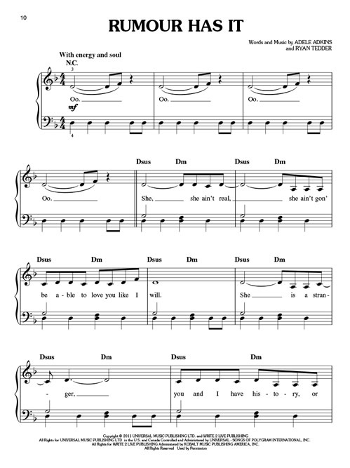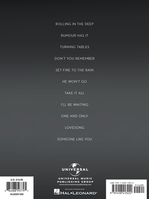 Arranjos facilitados para Piano; incluindo os sucessos “Rolling in the Deep” e “Someone like You”, mais: Don't You Remember • He Won't Go • I'll Be Waiting • Lovesong • One and Only • Rumour Has It • Set Fire to the Rain • Take It All • Turning Tables.