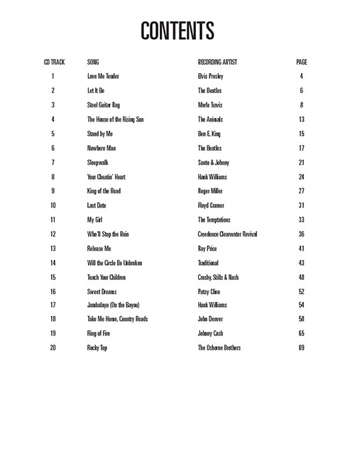 Play along with your favorite tunes from the Beatles, Hank Williams, Elvis Presley, Johnny Cash, CCR, John Denver and more! These 20 hit songs are presented in order of difficulty, beginning with simple rhythms and single-note melodies and ending with chord-melody style and more complex pedal and level combinations. The accompanying CD features every song recorded by a full band, so you can hear how each song sounds and then play along when you are ready.