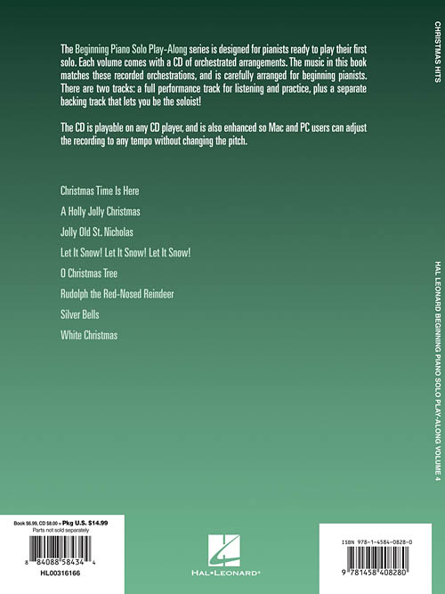 The Beginning Piano Solo Play-Along series is designed for pianists ready to play their first solo. Each volume comes with a CD of orchestrated arrangements. The music in this book matches these recorded orchestrations, and is carefully arranged for beginning pianists. There are two tracks: a full performance track for listening and practice, plus a separate backing track which lets you be the soloist! The CD is playable on any CD player, and is also enhanced so Mac and PC users can adjust the recording to any tempo without changing the pitch. This volume includes 8 songs to make holiday spirits bright: Christmas Time Is Here • A Holly Jolly Christmas • Jolly Old St. Nicholas • Let It Snow! Let It Snow! Let It Snow! • O Christmas Tree • Rudolph the Red-Nosed Reindeer • Silver Bells • White Christmas.