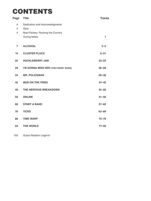 Take an in-depth look at the songs and solos of country guitarist extraordinaire Brad Paisley with this book/CD pack. Learn to play the key licks from 12 of his best, including: Alcohol • Cluster Pluck • Huckleberry Jam • I'm Gonna Miss Her (The Fishin' Song) • Mr. Policeman • Mud on the Tires • The Nervous Breakdown • Online • Start a Band • Ticks • Time Warp • The World.