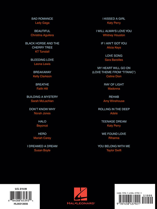 Transcrições para piano e voz na tonalidade original; incluindo: Bad Romance • Bleeding Love • Breathe • Don't Know Why • Halo • I Will Always Love You • If I Ain't Got You • Rehab • Rolling in the Deep • Teenage Dream • You Belong with Me • e outras!!!