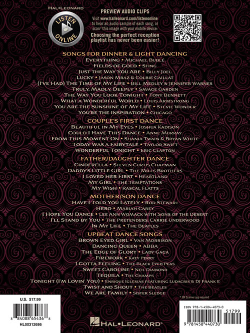 This outstanding collection features 35 selections perfect for all phases of a reception. Songs for dinner and light dancing, the couple's first dance, the father/daughter dance, and the mother/son dance are all represented here, plus some upbeat dance tunes!