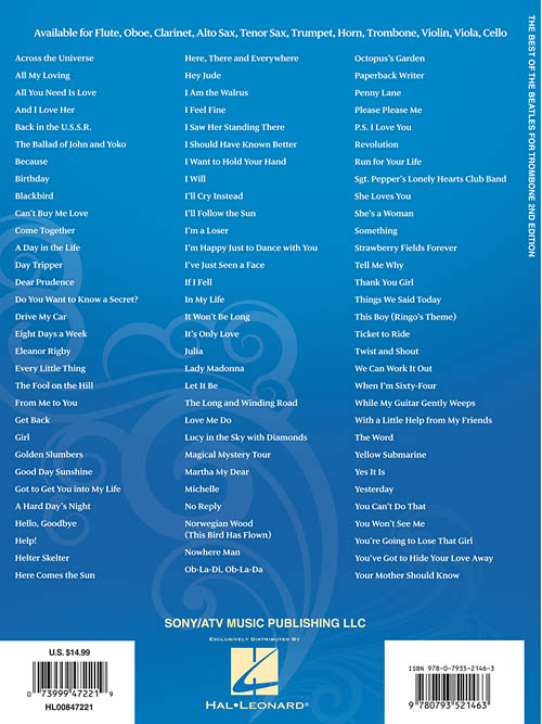 Transcrições para trombone de grandes sucessos dos Beatles; incluindo: All You Need Is Love • And I Love Her • The Fool on the Hill • Got to Get You Into My Life • Here, There, and Everywhere • Let It Be • Norwegian Wood • Something • Ticket to Ride • e muitas outras!!!
