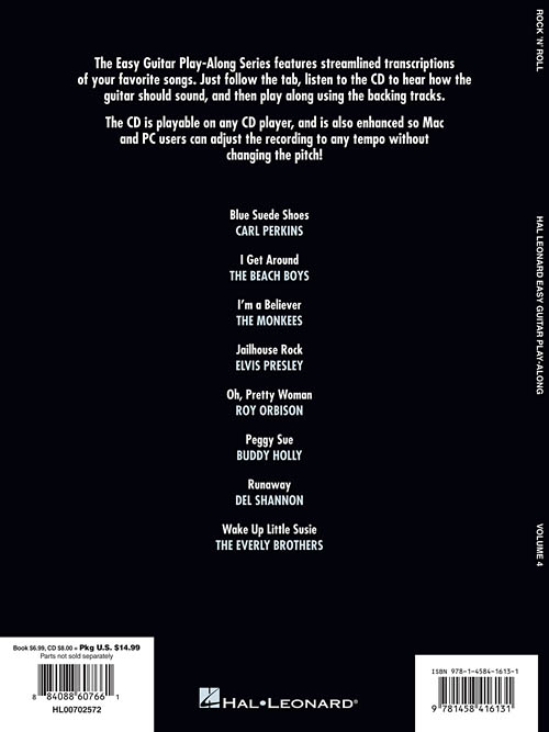 The Easy Guitar Play-Along® Series features streamlined transcriptions of your favorite songs. Just follow the tab, listen to the CD to hear how the guitar should sound, and then play along using the backing tracks. The CD is playable on any CD player, and is also enhanced to include the Amazing Slowdowner technology so MAC and PC users can adjust the recording to any tempo without changing the pitch! Volume 4 features 8 songs: Blue Suede Shoes • I Get Around • I'm a Believer • Jailhouse Rock • Oh, Pretty Woman • Peggy Sue • Runaway • Wake Up Little Susie.