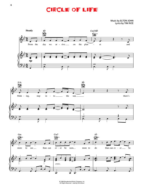 Transcrições para piano/voz e acordes para violão; incluindo: Be Prepared • Can You Feel the Love Tonight • Circle of Life • Hakuna Matata • I Just Can't Wait to Be King • Nants' Ingonyama.