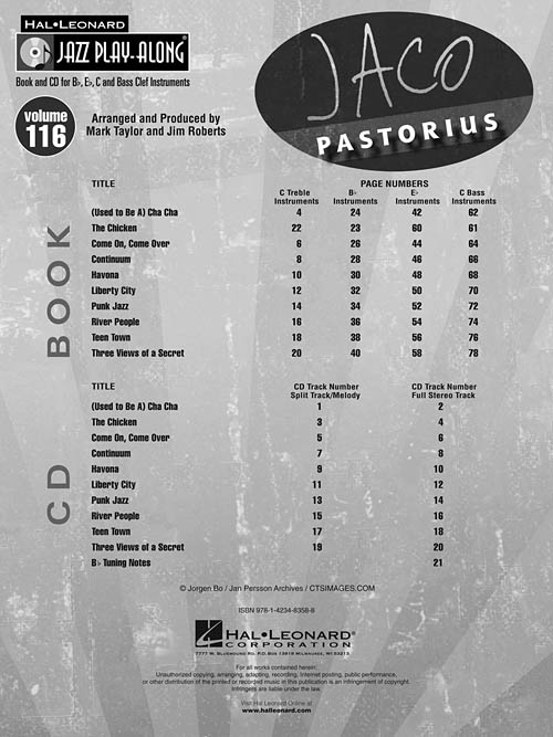 Esta série é uma excelente ferramenta de estudo para todos os músicos de Jazz. Todos os temas transcritos (melodia e acordes) para instrumentos em Bb, Eb, C e F. No CD cada tema tem duas gravações; uma faixa completa com a melodia e uma segunda faixa com o mesmo tema, porém sem a melodia, somente o play-back para que você possa tocar junto. Você ainda pode eliminar o Baixo ou o Piano usando o "balanço" do seu equipamento de som. "Chorus" adicionais para improvisação; incluindo: The Chicken • Come On, Come Over • Continuum • Havona • Liberty City • Punk Jazz • River People • Teen Town • Three Views of a Secret • (Used to Be A) Cha Cha.