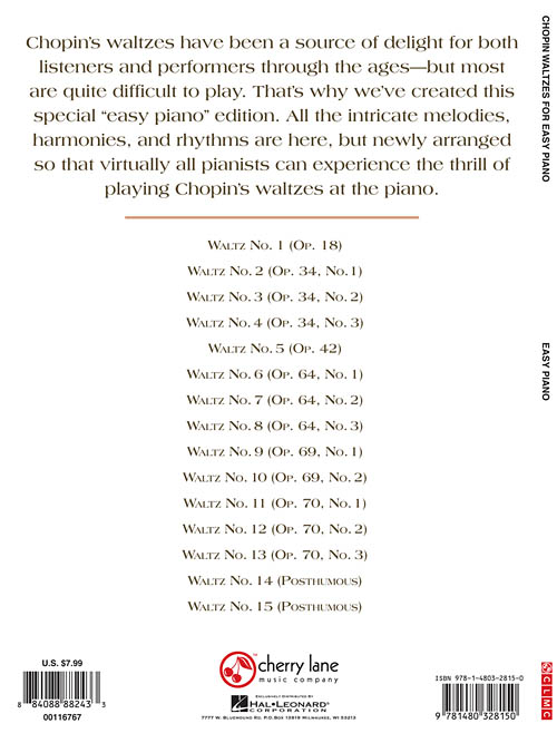 Chopin's waltzes have been a source of delight for both listeners and performers through the ages, but most are quite difficult to play. That's why we're created this special Easy Piano edition! All the intricate melodies, harmonies and rhythms are here, but newly arranged so that virtually all pianists can experience the thrill of playing 15 Chopin waltzes at the piano.