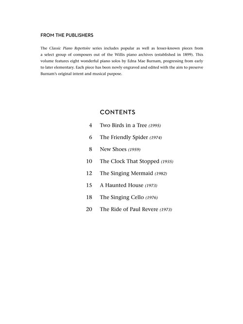 8 great Burnam piano solos ranging from early to later elementary have been newly engraved and edited for this collection: The Clock That Stopped · The Friendly Spider · A Haunted House · New Shoes · The Ride of Paul Revere · The Singing Cello · The Singing Mermaid · Two Birds in a Tree.