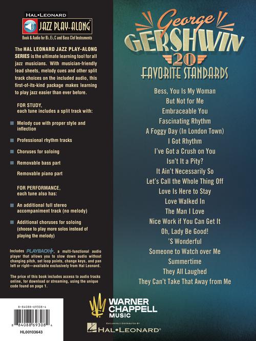 For use with all Bb, Eb, C and bass clef instruments, the Jazz Play-Along Series is the ultimate learning tool for all jazz musicians. With musician-friendly lead sheets, melody cues and other split-track choices on the included CD, this first-of-its-kind package helps you master improvisation while playing some of the greatest tunes of all time. FOR STUDY, each tune includes a split track with: · Melody cue with proper style and inflection · Professional rhythm tracks · Choruses for soloing · Removable bass part · Removable piano part. FOR PERFORMANCE, each tune also has: · An additional full stereo accompaniment track (no melody) · Additional choruses for soloing. This supersized collection includes 20 Gershwin standards.