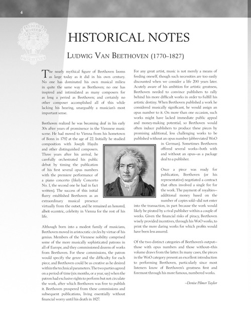Includes Six Variations on a Swiss Song, WoO 64, Nine Variations on Quant' è più bello from La Molinara by Giovanni Paisiello, WoO 69, Six Variations on Nel cor più non mi sento from La Molinara by Giovanni Paisiello, WoO 70, Eight Variations on Une fièvre brûlante from Richard Coeur-de-lion by André Ernest Modeste Grétry, WoO 72, and Six Variations in G Major, WoO 77. Schirmer Performance Editions are designed for piano students and their teachers as well as for professional pianists. These editions offer insightful interpretive suggestions, pertinent fingering, and historical and stylistic commentary. Prepared by experienced artists and master teachers, these publications provide an accurate, well-informed score resource for pianists.