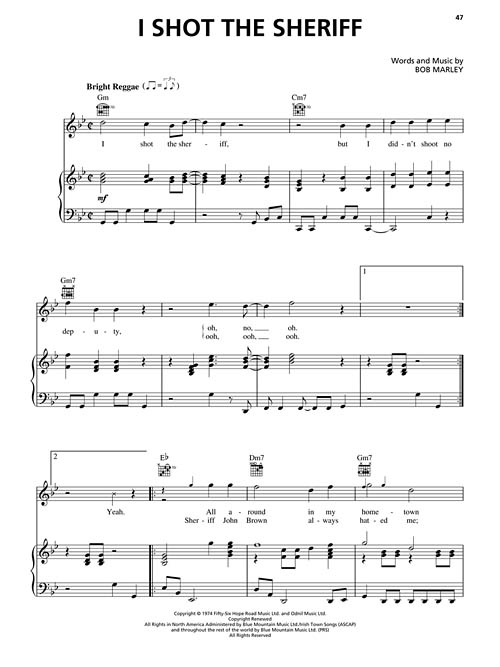 Transcrições para piano/voz e acordes para violão; incluindo: Bad Boys · Equal Rights · Get up Stand Up · The Harder They Come · I Shot the Sheriff · The Israelites · Legalize It · Many Rivers to Cross · A Message to You Rudy · No Woman No Cry · One Love · Pass the Dutchie · Pressure Drop · Red, Red Wine · Redemption Song · Three Little Birds · The Tide Is High · Tomorrow People · e outras!!!