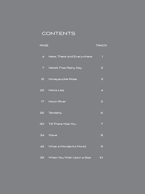 Transcrições para tenor ukulele, na partitura e tablatura; incluindo: Here, There and Everywhere · Here's That Rainy Day · Honeysuckle Rose · Mona Lisa · Moon River · Tenderly · Till There Was You · Wave · What a Wonderful World · When You Wish upon a Star.