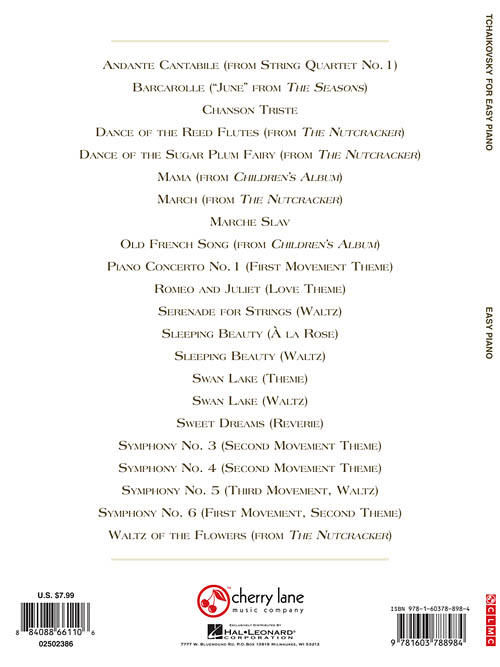 22 classics arranged for intermediate-level players, including: Andante Cantabile · Barcarolle in G Minor (June), Op. 37, No. 6 · Chanson Triste · Dance of the Sugar Plum Fairy · Marche Slav, Op. 31 · Romeo and Juliet (Love Theme) · The Sleeping Beauty Waltz · Theme from Swan Lake · Symphony No. 6 in B Minor (Pathetique) · Waltz of the Flowers · and more.