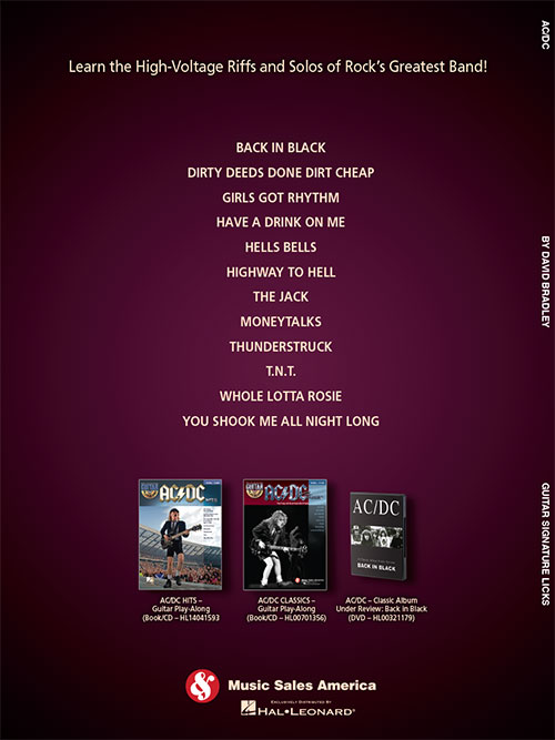 Aprenda os riffs e solos de Angus Young, David Bradley e Malcolm Young; incluindo: Back in Black • Dirty Deeds Done Dirt Cheap • Girls Got Rhythm • Have a Drink on Me • Hells Bells • Highway to Hell • The Jack • Moneytalks • Thunderstruck • T.N.T. • Whole Lotta Rosie • You Shook Me All Night Long. As faixas de áudio estão disponíveis online, juntamente com um player digital (Playback+) que permite alterar o andamento sem alterar o tom, escolher trechos específicos para tocar, além de balanço direita/esquerda.