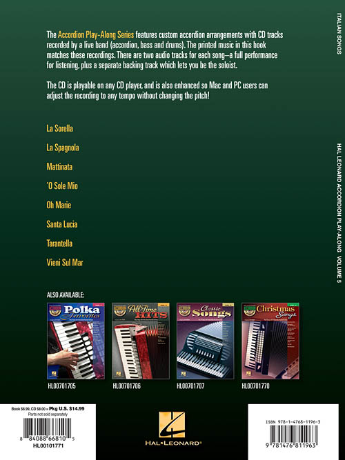 The Accordion Play-Along series features custom accordion arrangements with CD tracks recorded by a live band (accordion, bass and drums). There are two audio tracks for each song – a full performance for listening, plus a separate backing track which lets you be the soloist! The CD is playable on any CD player, and is also enhanced so Mac and PC users can adjust the recording to any tempo without changing the pitch! This volume features 8 songs: La Sorella • La Spagnola • Mattinata • 'O Sole Mio • Oh Marie • Santa Lucia • Tarantella • Vieni Sul Mar.