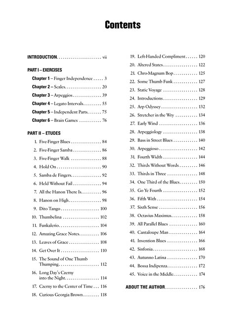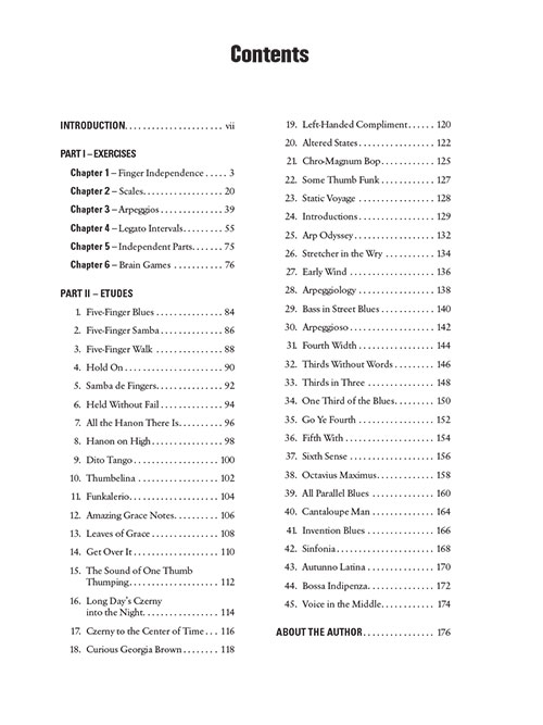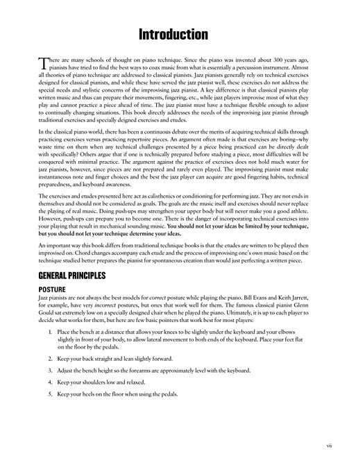 Este método traz exercícios de técnica tradicional para as necessidades específicas do piano jazz. Junto com exercícios de aquecimento, estudos isolados para cada situação no contexto de jazz. Isto permite a improvisação, abordando diretamente as necessidades do músico de Jazz. Praticar não pode ser apenas pragmático, tem que ser divertido. Os tópicos incluem: escalas (maior, menor, cromático, pentatônica, etc), arpejos (tríades, acordes de sétima, estruturas superiores), exercícios de independência (posição estática, notas realizadas, exercícios de Hanon), intervalo de escalas paralelas e exercícios (terças, trítonos, quartas, quintas, sextas, oitavas), e muito mais! Audio, disponível online para download ou streaming, com 45 exemplos gravados.